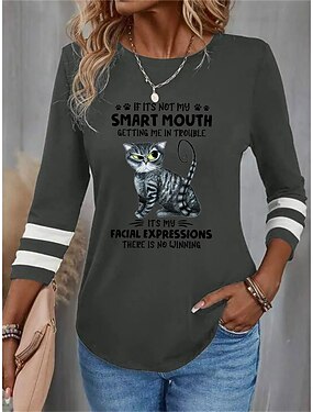 Dam T-shirt Crew Neck Långärmad Tunika Katt Bokstav Rolig Rund Hals Vanliga Toppar Daglig Weekend Tryck Svart Röd Blå Lila Grön Vår Höst