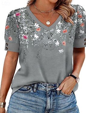Dam T-shirt Mönster Blommig Grafisk bohemliv Vintage Ledigt Kortärmad V-hals Vanliga toppar Dagligen Grå Sommar Vår
