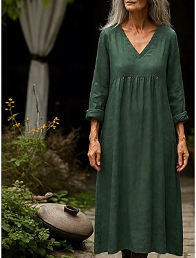 Dam Midiklänning Konstbomullslinne Kaftanklänning Vardagsklänning Vintage Mode Modern Utomhus Semester Utekväll Normal Slät Kortärmad V-hals Blå Brun Grön Grå Sommar Vår