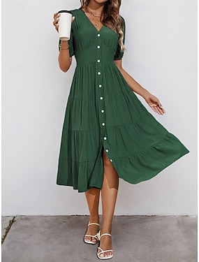 Dam Midiklänning Vardagsklänning Swingklänning A linjeklänning Grundläggande Ledigt Semester Dagligen Normal Slät Kortärmad V-hals Grön Sommar