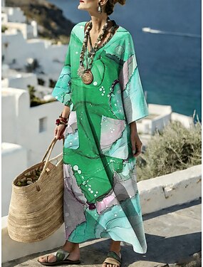 Kvinnors Maxi Klänning Linne Likt Shift Klänning Avslappnad Dagslång Löst Passform Grafisk Geometrisk Abstrakt Lång Ärmar V Nack Blå Lila Orange Grön Sommar Vår