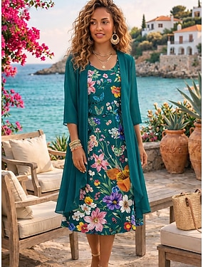 Dam Klänning Set A linjeklänning Elegant Semester Blommig Grafisk Multi lager Mönster Midiklänning 3/4 ärm Rund hals Dagligen Semester Blå Rodnande Rosa Grön Sommar Vår Normal
