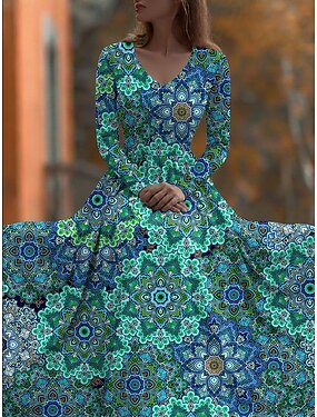 Kvinnors Maxi Klänning A-linjeformad Klänning Passform Och Flare Klänning Vintage Boho Datum Regular Fit Blommig Grafik Lång Ärmar V-Hals Grön Vår Höst Vinter