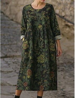 Kvinnors maxiklänning i linneliknande andningsbart lättviktigt kaftan 3/4 ärm rund hals avslappnad skiftklänning klänning boho daglig semester dejt blommig grafisk gul rosa blå grön vår höst