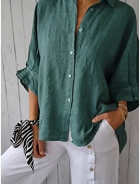 Dam Skjorta Knapp Upp Blus Konstbomullslinne Knappar Ensfärgat Grundläggande Ledigt Långärmad V-hals Vanliga toppar Dagligen Grön Sommar Vår Höst