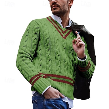 Herr Jultröja Jultröjor Semestertröja Pullover tröja Stickad tröja Ribbad Sticka Vanliga toppar Stickat Färgblock V-hals Mode Grundläggande Semester Dagliga kläder Kläder Höst vinter Vit Gul S M L