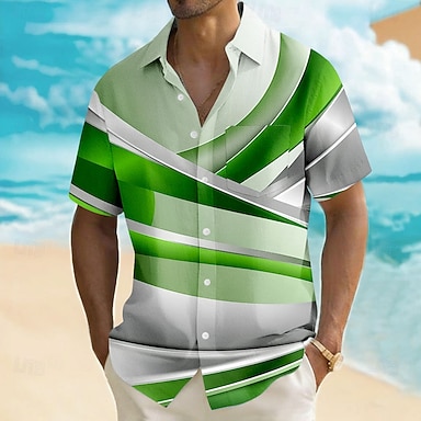 Herr Geometrisk Randig Skjorta Bowlingskjorta Lägerskjorta Kortärmad Mode Casual Streetwear Semester Sommar Vår Kubansk krage 3D-utskrift Skjortor med knappar Blå Svart Vinröd Grön