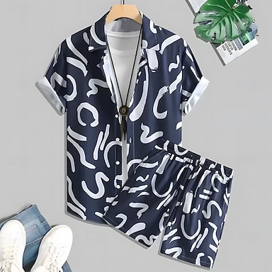Herr Geometrisk 2st Skjortor Set Summer Tops Kortärmad Korta byxor Nedvikt Ledigt Tillflykt Utomhus Ledigt Dagligen 3D-utskrift Sommar Rödhakeägg blå