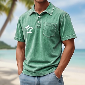 Herr Palmträd Syratvättad skjorta 100% Bomuld Kortärmad Polotröjor Kavajslag Hawaiisk Ledigt Fritids- Semesterkläder Ficka 3D-utskrift Knappar Vår & sommar Blå Brun Grön