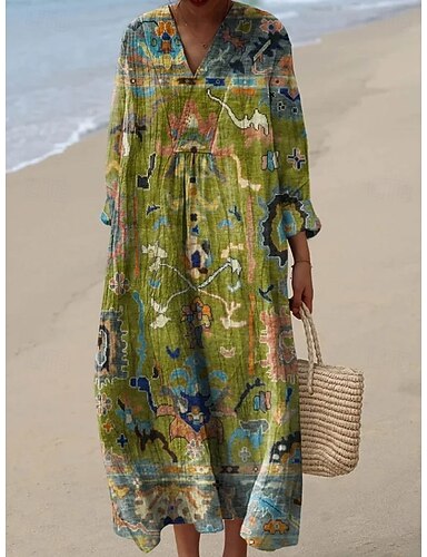 Dam Maxiklänning Solklänning A linjeklänning Semester Ledigt Boho Strand Fest Normal Grafisk Geometrisk Paisley Långärmad V-hals Blå Grön Kaki Sommar Vår