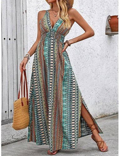 Dam Maxiklänning A linjeklänning Slipklänning Semester Ledigt Boho Fest Utekväll Standardpassform Blommig Grafisk Ärmlös V-hals Rubinrött Blå Grön Sommar Vår