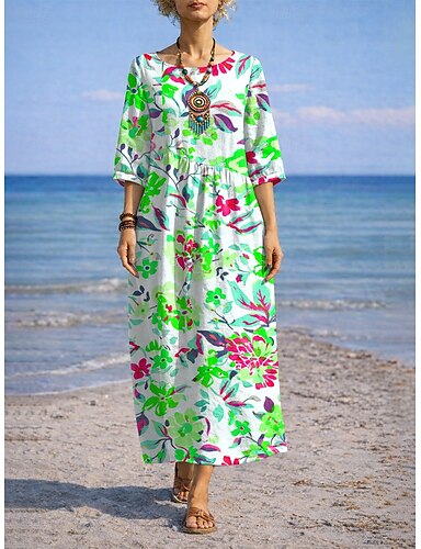 Dam Maxiklänning Skiftklänning Semester Ledigt Strandstil Strand Utekväll Lös passning Blommig Grafisk 3/4 ärm Rund halsringning Blå Rubinrött Purpur Grön Sommar Vår