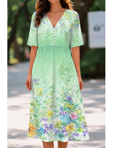 Dam Midiklänning A linjeklänning Semester Ledigt Boho Normal Blommig Grafisk Kortärmad V-hals Blå Orange Grön Beige Sommar Vår