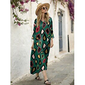 Kvinnors Midi Klänning Linne-liknande Andningsbar Lättvikts Sommarklänning A-Linje Klänning Semester Avslappnad Boho Strand Löst Passform Grafisk Geometrisk 3/4 Längd Ärmar V-Hals Blå Svart Brun Grön