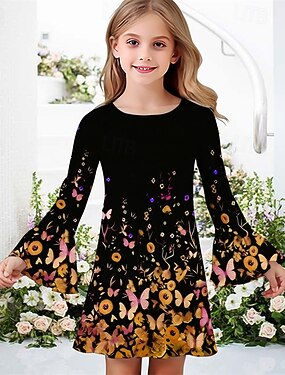 Flickor 3D Fjäril Klänning Volangkjol Långärmad Sommar Vår Semester Dagligen Helgdag Skön Ljuv Barn 4-12 år Vardagsklänning Knälång Normal