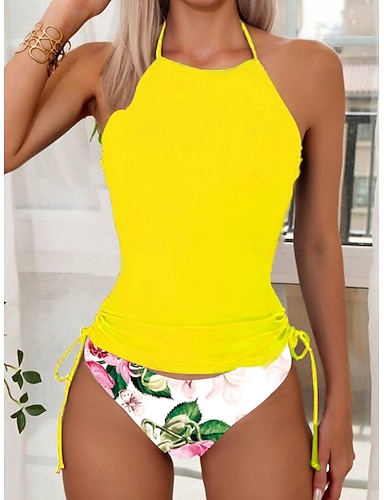 Dam Tankini Tvådelad baddräkt Öppen rygg Badkläder Blommig Badkläder Svart Gul Andningsfunktion Snabb tork Lättvikt Ärmlös - Simmning Surfing Strand Sommar Vår