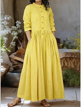 Dam Maxiklänning Konstbomullslinne Klänning i bomullslinne Mode Modern Dagligen Utomhus Semester Lös passning Slät Långärmad V-hals Svart Vit Gul Marinblå Sommar Vår