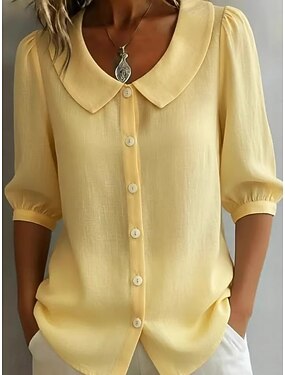 Dam Linneskjortor i bomull Konstbomullslinne Knappar Ensfärgat Stylish Grundläggande Ledigt 3/4 ärm Tröjkrage Vanliga toppar Dagligen Blå Svart Gul Purpur Fuchsia Sommar Vår
