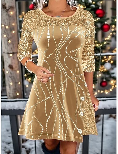 högtidsklänning för kvinnor med trekvartsärm med paljettprydd passform och knälång festkväll i rött guld glittrande komfort stretch vinterkläder