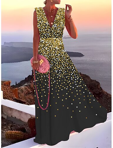 Dam Långklänning Maxiklänning Balklänning Festklänning Bröllopsgästklänning Swingklänning Mode party Mogna Semester Kvällsfest Bröllopsgäst Normal Nyans Ärmlös Djup V-hals Blå Silver Gul Marinblå