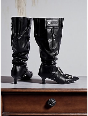 Damstövlar över knäna med slouch-design och blockklackar, urban avslappnad vardagsstil, perfekt för kvinnors city streetwear och avslappnade outfits