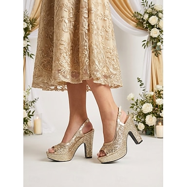 Damsandaler med guldfärgad platå – glittriga, grova klackar och öppen tå för cocktailpartyn och kvällsevenemang &utekväll