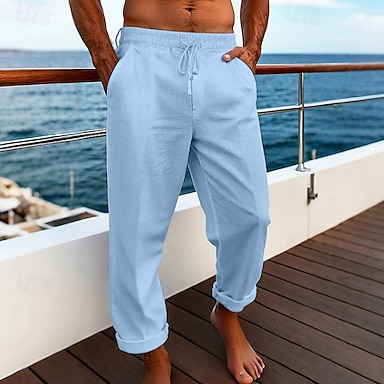 Herr Linne Byxor Långbyxor Sommarbyxor Säckiga byxor Strandbyxor Snörning Elastisk midja Rakt ben Slät Komfort Andningsfunktion Fullängd Ledigt Dagligen Helgdag Semester Mode Vit Marinblå