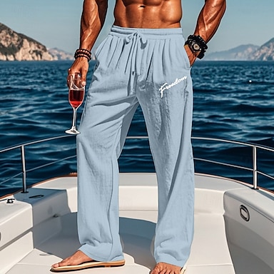 herrbyxor i bomullslinne med dragsko elastisk midja vida ben baggy byxor grafiskt bokstavstryck komfort fullängd utomhus streetwear semester hawaiian byxor vit blå mikroelastisk