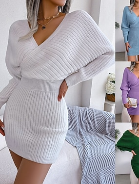 Dam Tröja Tröja klänning Ledigt Mjukt Ren färg Ribbad V-hals Stickat Långärmad Långa toppar Sticka Utomhus Fest Dagligen Svart Vit Vår Höst