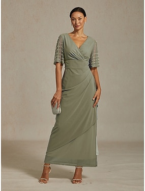 Dam Maxiklänning Sheath Dress Elegant Fjärilsärmar Bröllopsgäst Cocktailfest Nät Utsmyckad Normal Ensfärgat Halvlång ärm V-hals Salvia grön