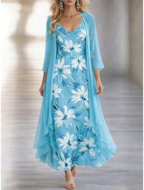 Dam Klänning Set A linjeklänning Elegant Semester Blommig Grafisk Multi lager Mönster Maxiklänning 3/4 ärm V-hals Fest Blå Rodnande Rosa Orange Sommar Vår Normal