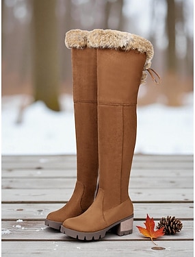 Bruna vinterstövlar över knäna för dam – fuskpälskant, tjock blockklack, mysig stil i kallt väder för fester och utomhuskläder