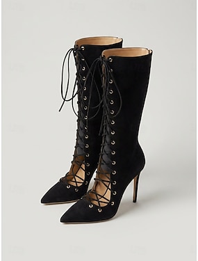 Svarta knähöga snörstövlar för kvinnor – spetsiga stilettklackade stövlar för nattliv, fest och klubb &mode streetwear