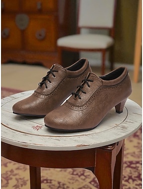 Damskor med halvhög klack och utskurna vintage-motiv från 1930-talet – retroskor i konstläder för swingdans, tebjudningar och pinup-mode