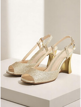 Damskor med guldfärgad glitter och hög klack, eleganta klänningsskor med öppen tå för bröllopsgäster, trädgårdsbröllop &formella evenemang