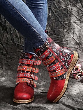 Röda mockastövlar med dubbla spännen och rejäl klack för dam, snygga och mysiga, perfekta för jul, vinterutflykter och högtidsfester