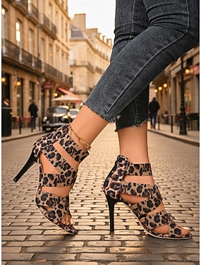 leopardmönstrade högklackade klänningsskor för kvinnor – sandaler med peep toe-motiv och dragkedja, snygga kvällsskor för fester och formella evenemang
