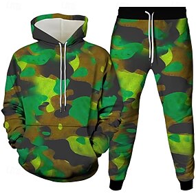Herr Kamuflasje 2st 3D-tröja set Träningsoverall Hoodie-tröja Långärmad Långa byxor Huva Ledigt vardag Fritids- 3D-utskrift Vår Höst Vinter Armégrön