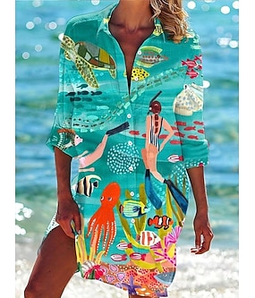 Kvinnors mini klänning skjorta klänning Hawaiian skjortor Flowy Strand grafik lång lång ärm skjorta krage knapptryck formpassning semester grön sommar semester kläder strand kläder