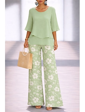 Dam Skjorta Tvådelade set Blus Byxor med vida ben 3/4 ärm Rund hals Slät Mode Streetwear Dagligen Ledigt Dagligen Svart Vit Armégrön Sommar Normal