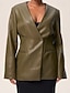 Dam Imitationsläderjacka Bekväm Ficka Knappar Vintage Ledigt Slät Semester Ledigt Dagliga kläder Utekväll Normal Lång V-hals Normal Långärmad Ytterkläder Svart Grön Höst Vinter