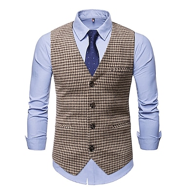 Herr Väst Bröllop Arbete Företag Dagligen Affär Ledigt Vinter Ficka Polyester Vindtät Snabb tork Pläd / Rutig Enkelknäppt V-hals Normal Ljusgrå Mörkgrå Kaffe Väst