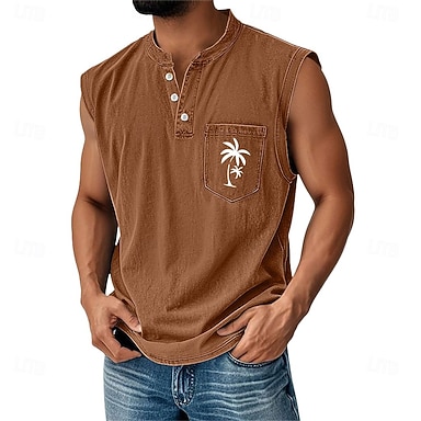 Herr Tvätta skjorta i 100 % bomull Ärmlös tröja Ärmlös Henley Sommar Kokos Ledigt Henley Färgade plagg Urblekt Grafisk Ledigt Dagligen Streetwear Svart Ljusgrön Mörk marin Topp t-shirt för män
