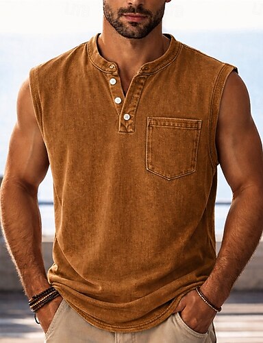 Herr Tvätta skjorta i 100 % bomull Ärmlös tröja Ärmlös Henley Sommar Kokos Ledigt Henley Färgade plagg Urblekt Grafisk Ledigt Dagligen Streetwear Svart Ljusgrön Mörk marin Topp t-shirt för män