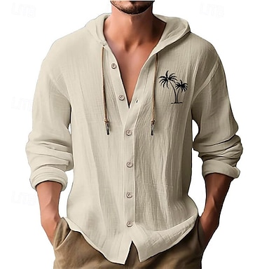Herr Vit bomullsskjorta Minimalistisk Aloha skjorta Casual skjorta Knapp upp skjorta Bomullskjorta Kokosnötsträd Semester Gata Svart Vit Blå Kaki Långärmad Huva Vår & sommar Kläder Button-Down
