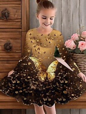 Flickor 3D Fjäril Klänning Volangkjol Långärmad Sommar Vår Semester Dagligen Helgdag Skön Ljuv Barn 4-12 år Vardagsklänning Knälång Normal