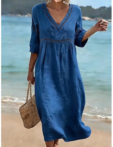 Dam Midiklänning A linjeklänning Ledigt Utomhus Strand Utekväll Lös passning Ensfärgat 3/4 ärm V-hals Blå Svart Gul Rodnande Rosa Sommar Vår product tag