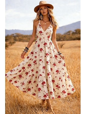 Dam Maxiklänning Solklänning A linjeklänning party Ledigt Boho Helgdag Normal Blommig Grafisk Färgblock Ärmlös V-hals Beige Sommar Vår Höst Vinter