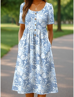Dam Midiklänning T shirtklänning A linjeklänning Sommarklänning bohemliv Semester Vintage Normal Blommig Grafisk Kortärmad Rund hals Ljusblå Sommar Vår