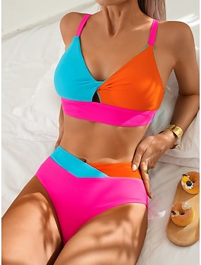 Kvinnors Bikini 2 Delad Baddräkt En Axels Färgblock Trosor Slim Bar Ryggen Höga Midja Semester Strandkläder Enfärgad V-Hals Utan Ärmar Baddräkter
